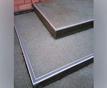 Способ монтажа: алюминиевый порожек без вставки крепится в проем между двумя напольными покрытиями или на ступени при помощи саморезов. Затем прорезиненную ПВХ вставку нужно нагреть строительным или обычным феном, либо подержать в горячей воде, чтобы материал стал мягче и легче вошел в паз профиля.